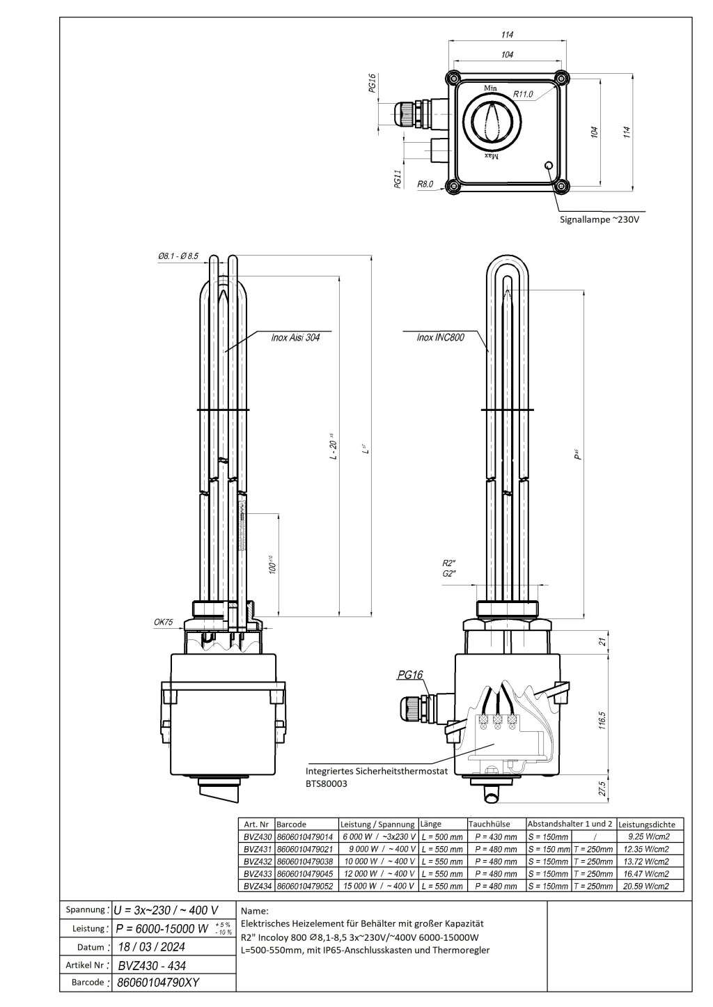 Elektromos csőfűtőbetét nagy űrtartalmú bojlerhez R2" Aisi 316L Ø8.1 mm 12000 W L=550 mm csatlakozóburkolattal és hőmérsékletszabályozással