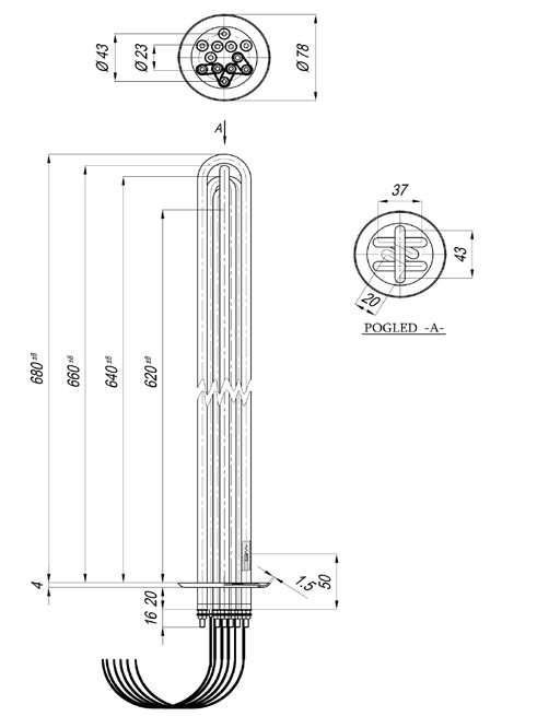 Elektromos csőfűtőbetét kazánhoz Mikoterm ST Cu Ø8.1mm ~ 6x230V 18000W L=700mm szilikon vezeték 2.5 Lk=1000mm