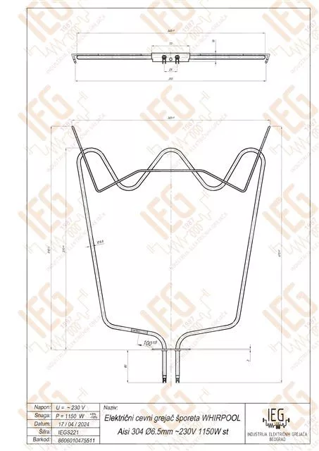 Elektromos csőfűtőbetét IGNIS WHIRPOOL tűzhelyhez Aisi 304 Ø6.5 mm ~230 V 1150 W